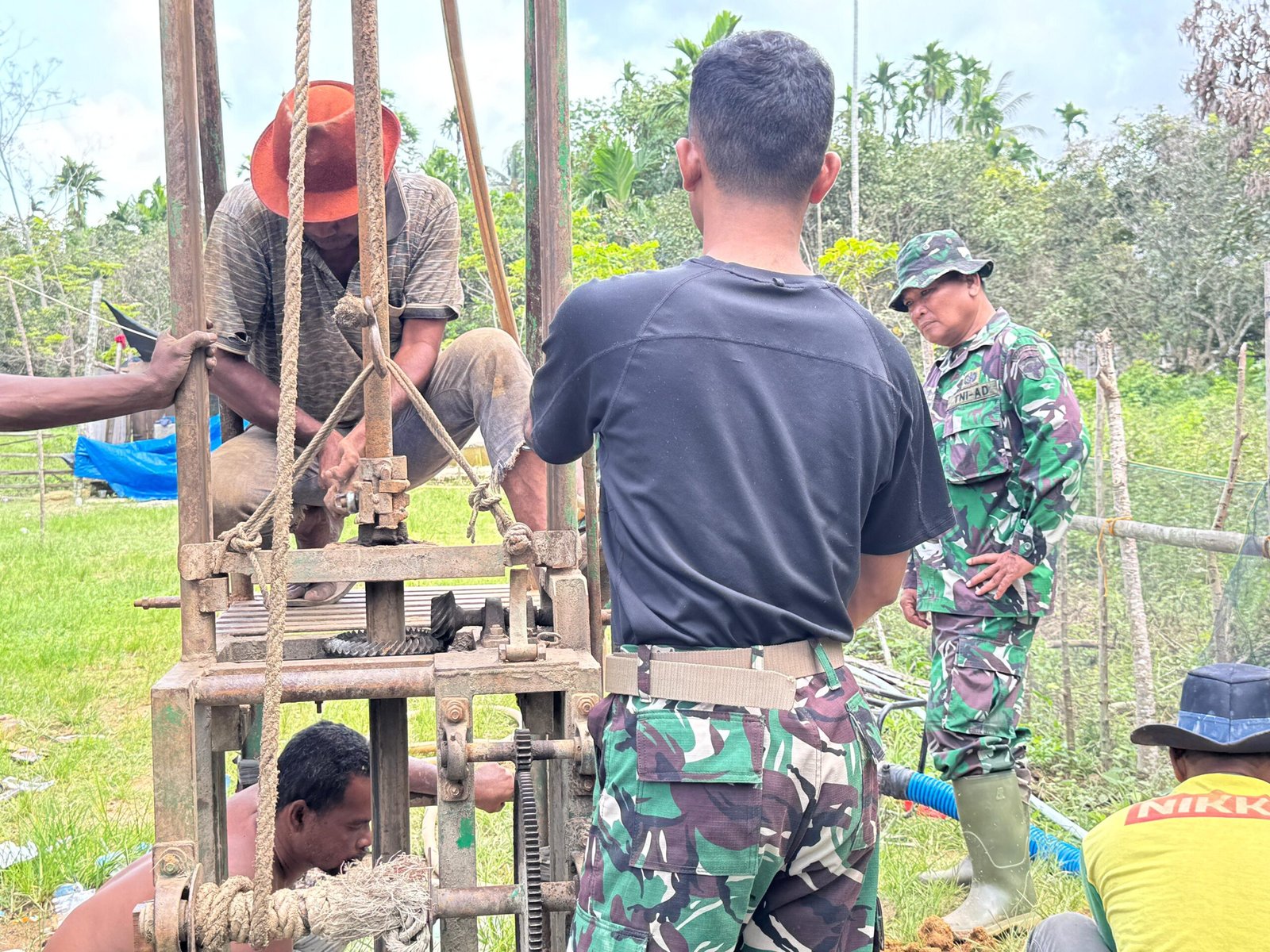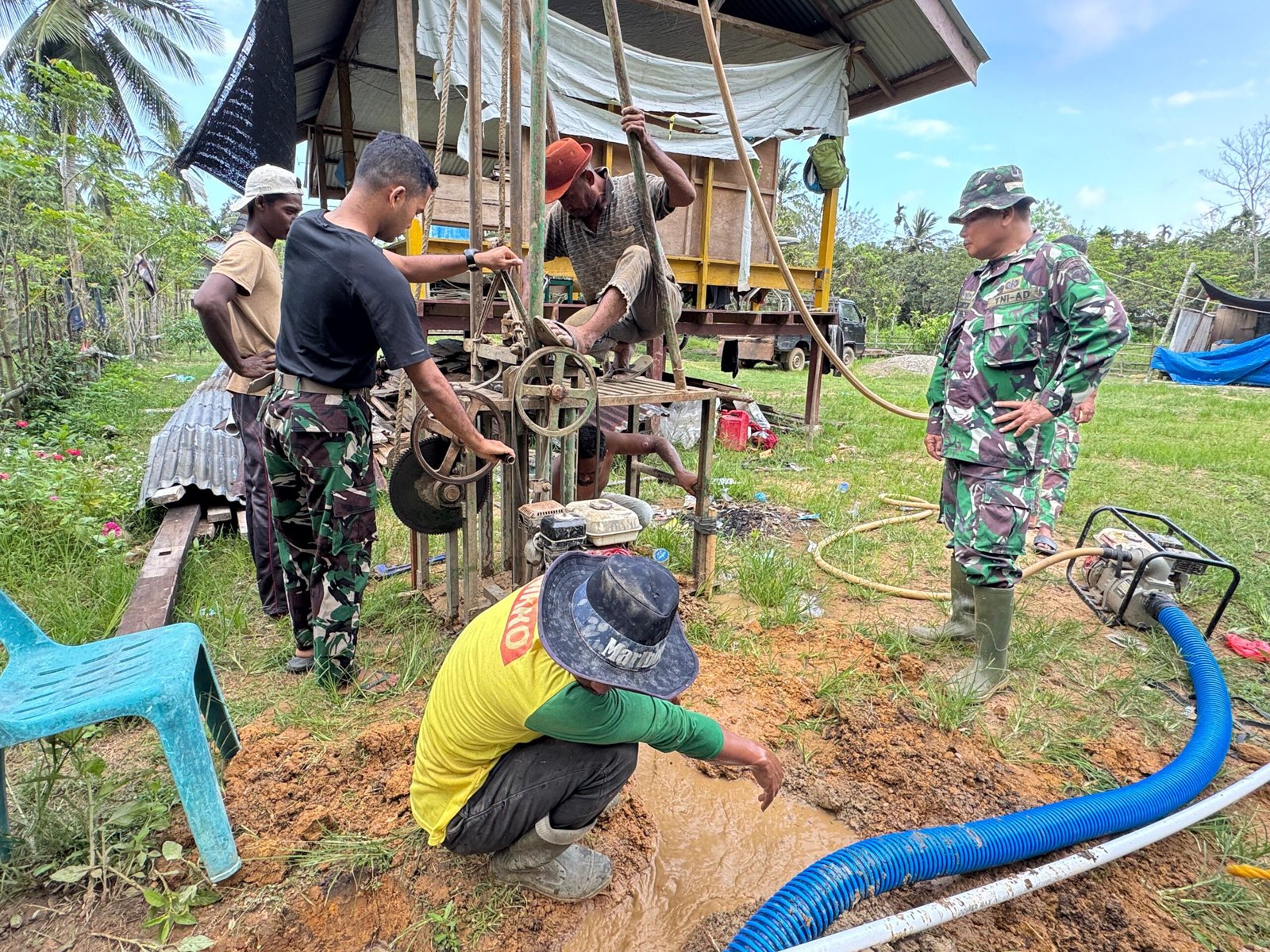 Personel Satgas TMMD bersama masyarakat tampak bahu-membahu menyelesaikan pekerjaan. Mulai dari proses pengeboran, pemasangan instalasi hingga penyiapan fasilitas pendukung dilakukan secara gotong royong, mencerminkan kuatnya kemanunggalan TNI dan rakyat di lapangan.