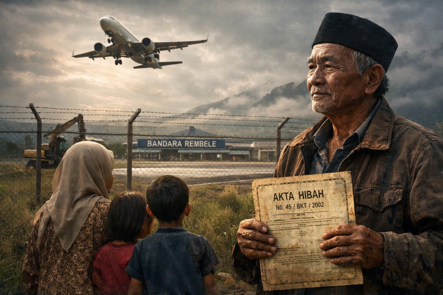 Ilustrasi Seorang ahli waris memegang dokumen Akta Hibah di depan pagar Bandara Rembele, sementara pesawat lepas landas di belakangnya, menggambarkan harapan dan hak yang masih menggantung.