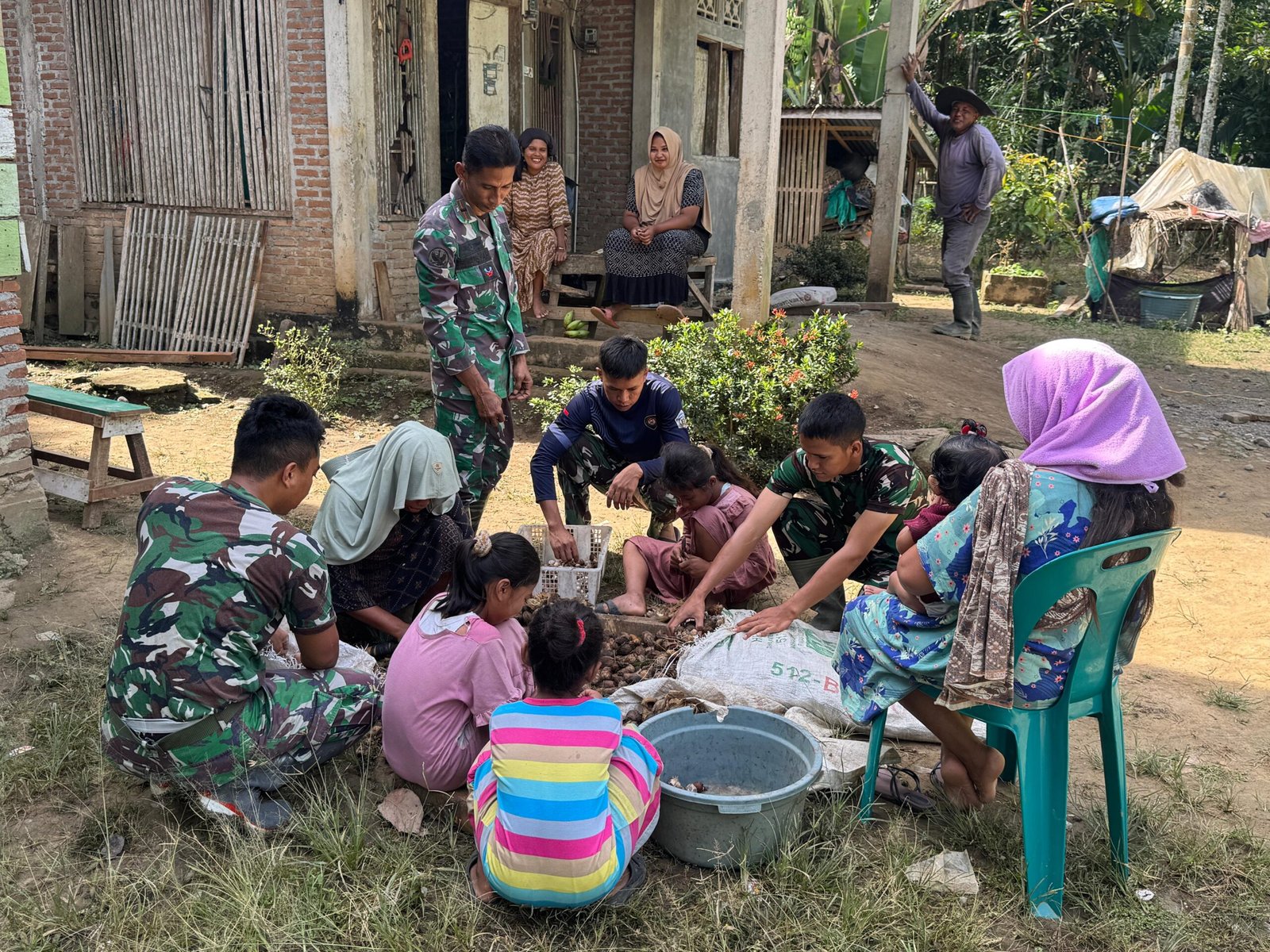 Di sela kesibukan pembangunan fisik, personel Satgas TMMD meluangkan waktu menjalin silaturahmi dan komunikasi sosial bersama warga. Suasana sederhana penuh keakraban tampak saat prajurit duduk bersama masyarakat, berbincang santai, sekaligus mendengarkan langsung aspirasi dan harapan warga desa.