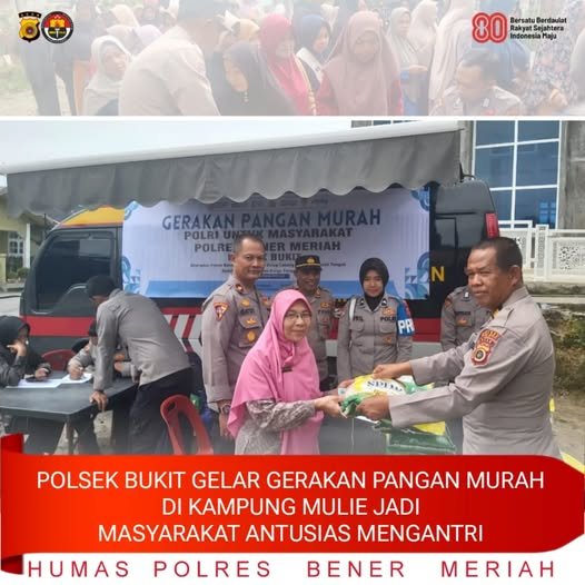 Bener Meriah – Polsek Bukit bersama Pemerintah Kabupaten Bener Meriah kembali menggelar Gerakan Pangan Murah di Kampung Sedie Jadi, Kecamatan Bukit, Rabu (28/8/2025).