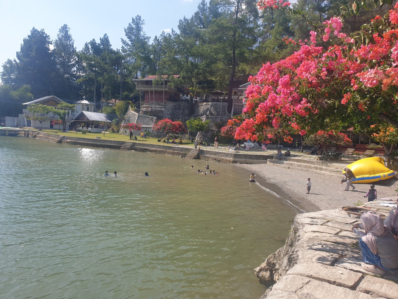 Angin pegunungan berembus pelan, menyapu permukaan danau yang jernih. Riak air bergerak perlahan, memantulkan langit biru dan barisan bukit yang mengelilinginya. Di tepian, anak-anak terlihat bebas bermain air, berenang di kawasan dangkal yang aman. Tawa mereka pecah, menyatu dengan suara alam yang damai.