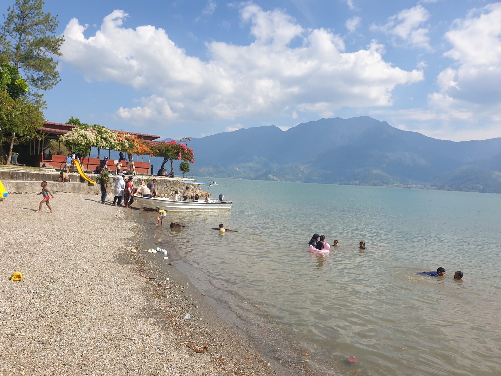 Sementara itu, para orang tua duduk santai di balai-balai kayu, menikmati suasana bersama keluarga. Sebagian lainnya memilih mengabadikan momen, menjadikan lanskap Lut Tawar sebagai latar keindahan yang tak lekang oleh waktu.