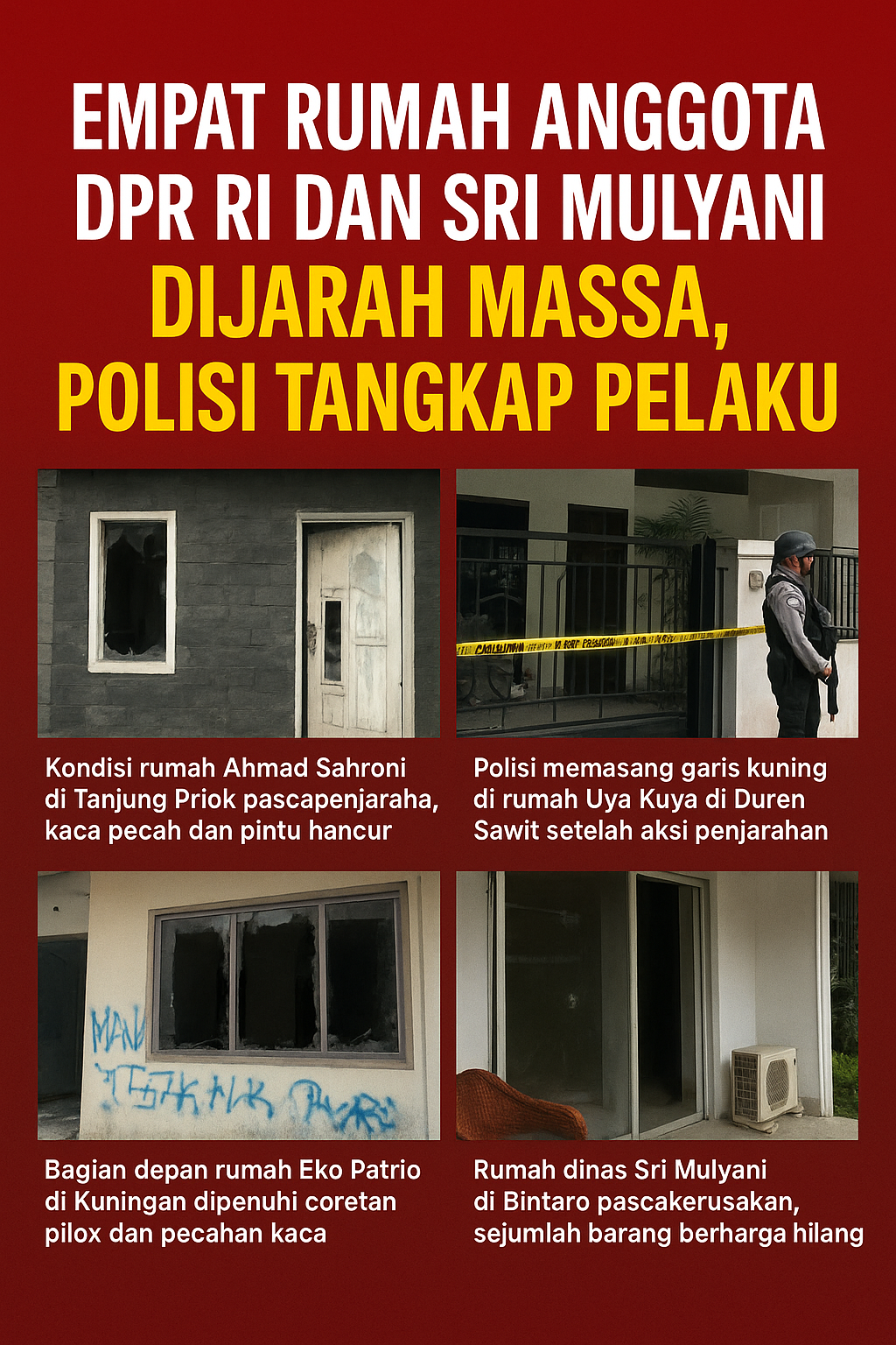Jakarta – Gelombang aksi massa yang berlangsung sejak akhir Agustus 2025 berujung pada penjarahan terhadap sejumlah rumah pejabat negara. Sedikitnya empat rumah anggota DPR RI dan rumah Menteri Keuangan Sri Mulyani menjadi sasaran amukan massa pada Sabtu (30/8) hingga Minggu (31/8).