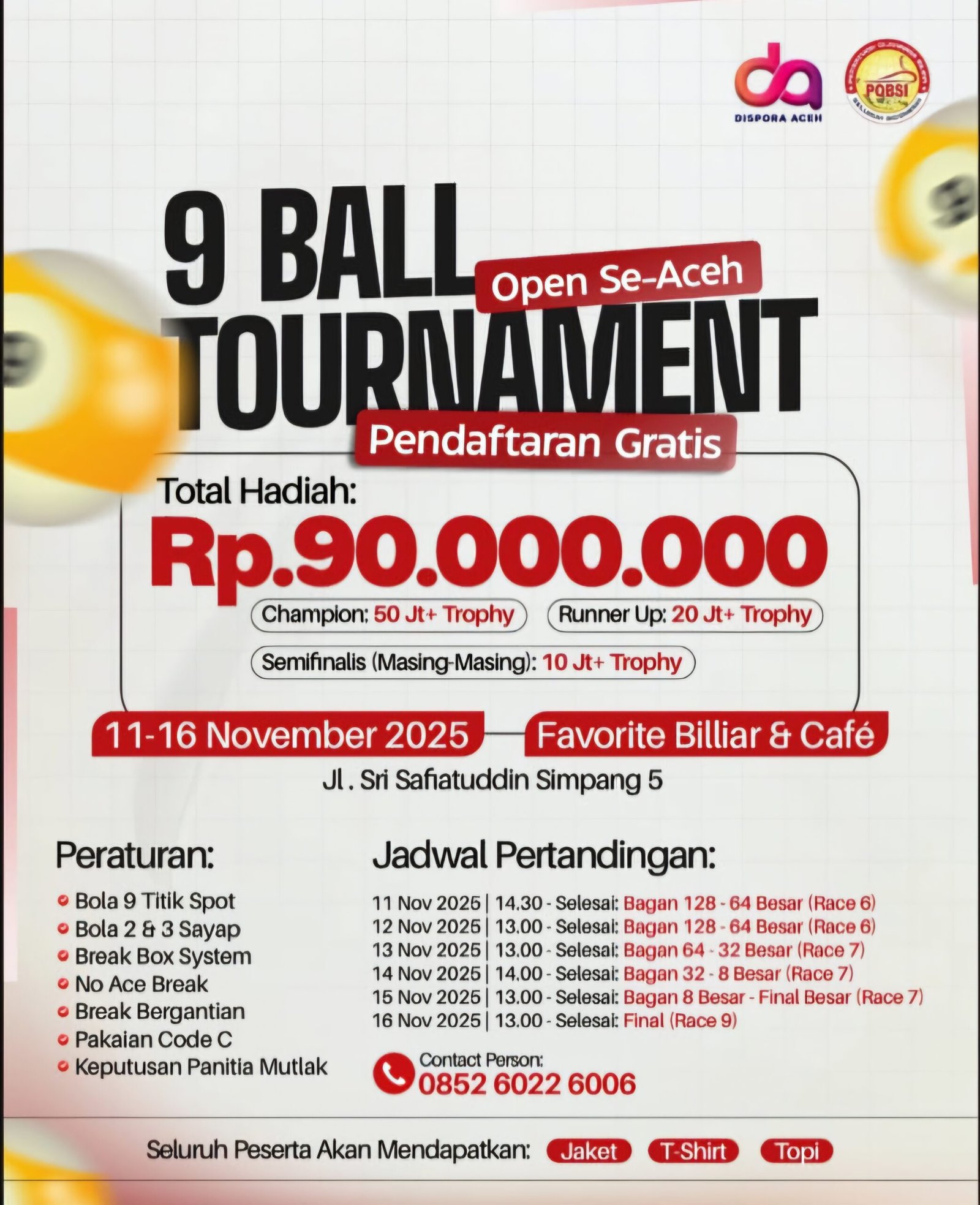 Banda Aceh – Pengurus Provinsi Persatuan Olahraga Biliar Seluruh Indonesia (POBSI) Aceh bekerja sama dengan Dinas Pemuda dan Olahraga (Dispora) Aceh akan menggelar Turnamen 9 Ball Open Se-Aceh pada 11–16 November 2025 di Favorite Billiard & Café, Jalan Sri Safiatuddin Simpang 5, Banda Aceh.