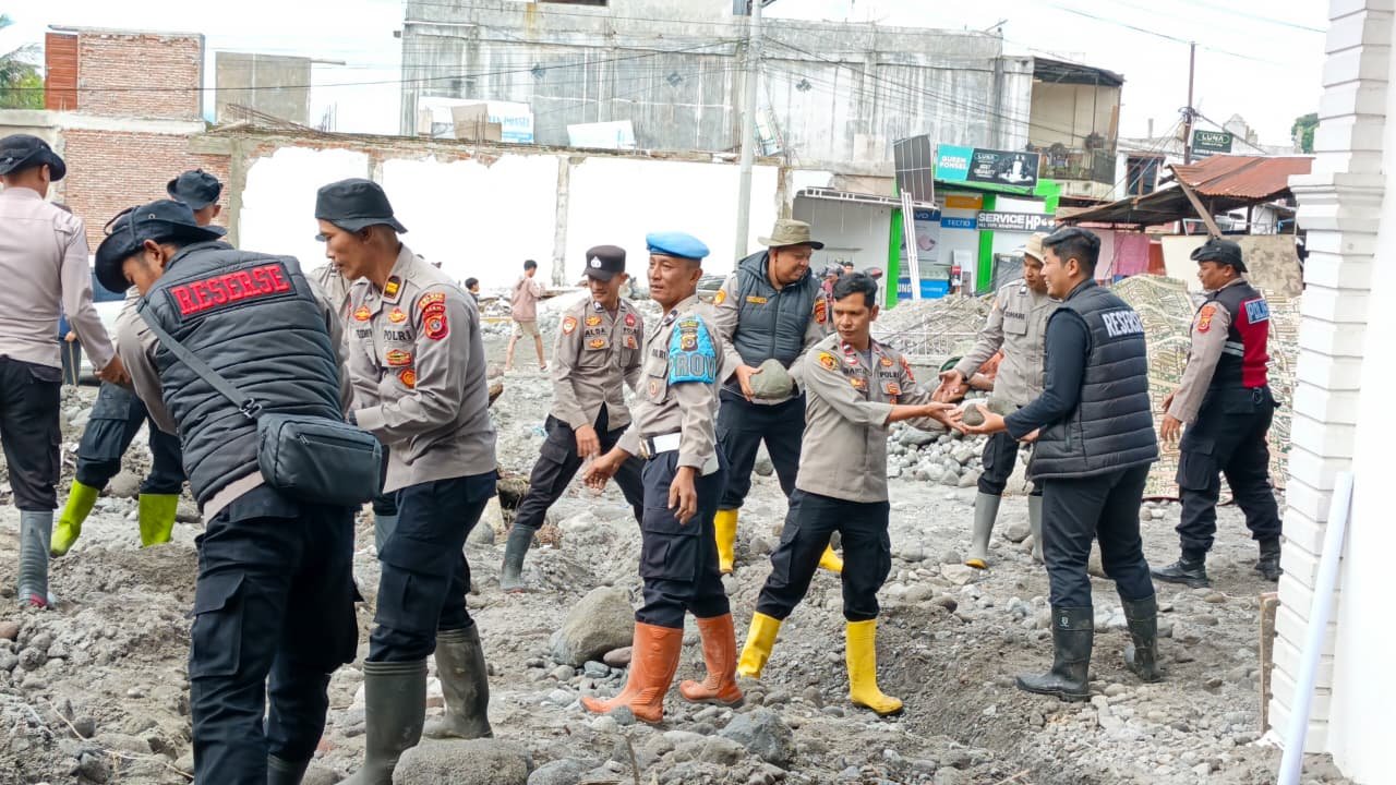 Sebanyak 50 personel Polri,  bahu-membahu mengangkat batu besar, menyekop pasir, dan membersihkan lumpur yang menempel di setiap sudut bangunan.