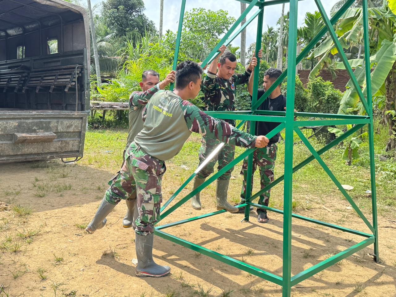 Pada tahap pekerjaan kali ini, personel Satgas TMMD melaksanakan penurunan tower tandon air sebagai bagian dari proses penyempurnaan sarana penampungan air bersih yang tengah dibangun.